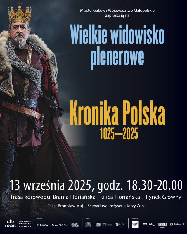 w związku z obchodami Jubileuszu Tysiąclecia Korony Polskiej Miasto Kraków, we współpracy z Województwem Małopolskim oraz Teatrem KTO, organizuje wyjątkowe wydarzenie: wielkie widowisko plenerowe „Kronika Polska 1025-2025”, które odbędzie się 13 września br. o godz. 18.30. Rozpoczęcie korowodu na ulicy Floriańskiej.